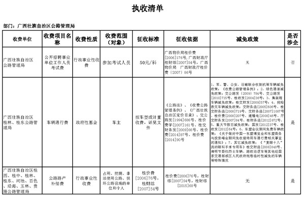 河池公路管理局行政事业性收费信息