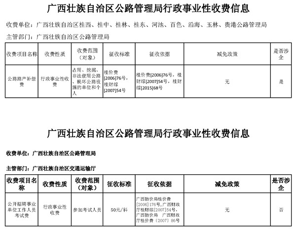 河池公路管理局行政事业性收费信息