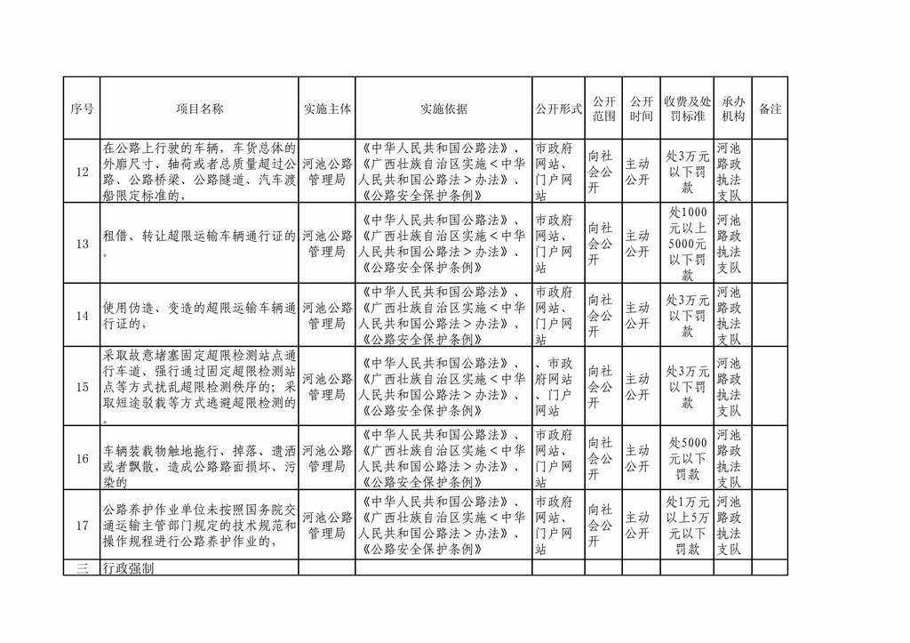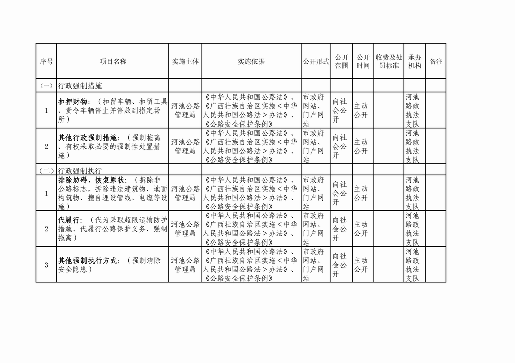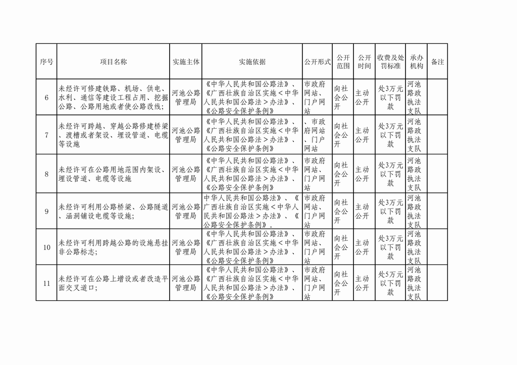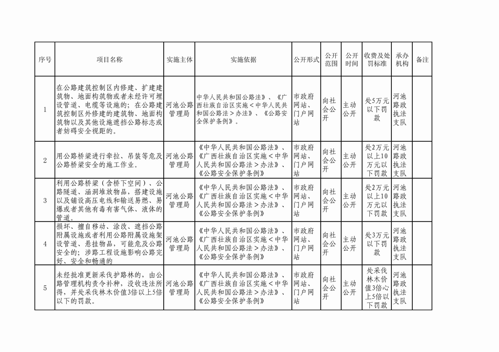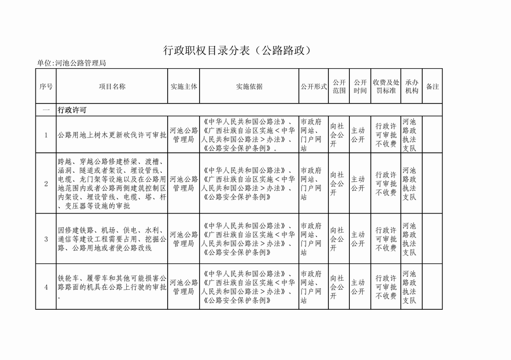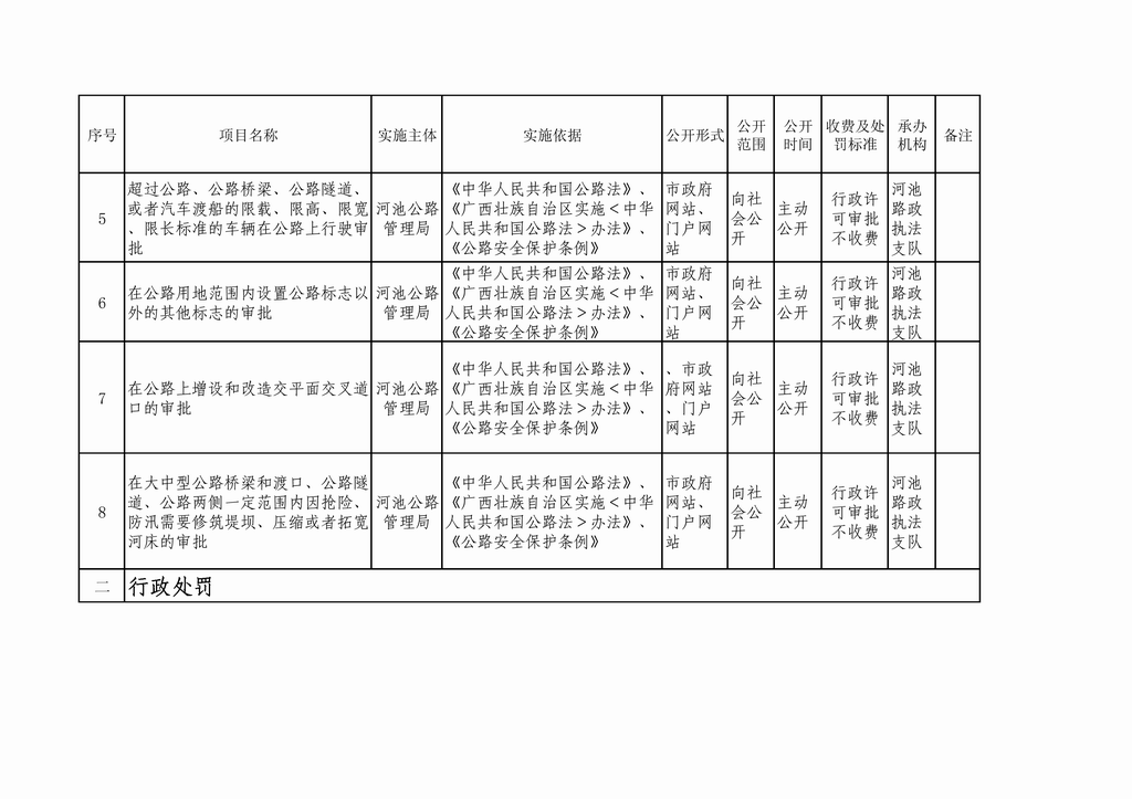 河池公路管理局行政审批事项公开目...