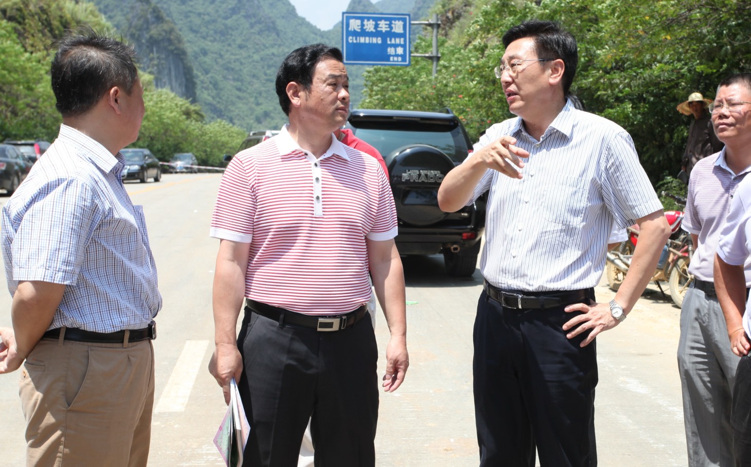 河池市人民政府市长何辛幸(右一)在河池公路管理局局长唐祥明(左二)等陪同下,深入国道210线都安高岭路段检查指导水毁抢修工作。