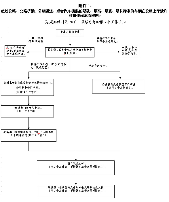 超过公路、公路桥梁、公路隧道、或者汽车渡船的限载、限高、限宽、限长标准的车辆在公路上行驶许可操作规范流程图驶许可操作规范流程图: