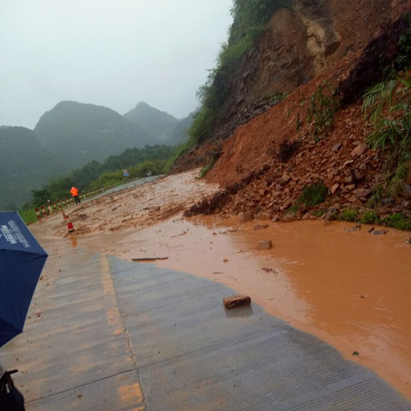 6月16日9时许,受强降雨影响,省道211线红渡至大化二级公路K2+500(都安县澄江镇红渡村下楼屯)上边坡发生泥石流塌方500多立方米,覆盖全幅路面,造成交通中断。