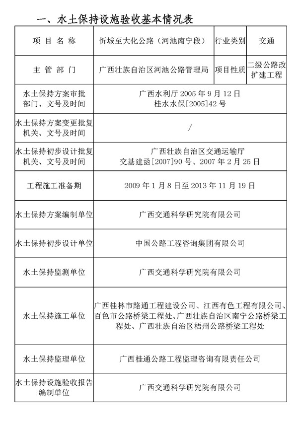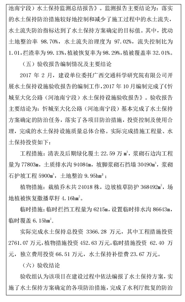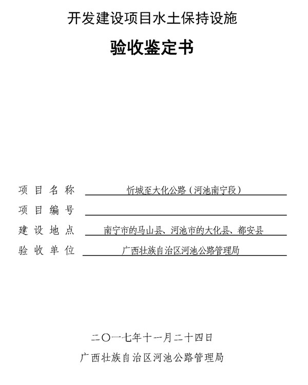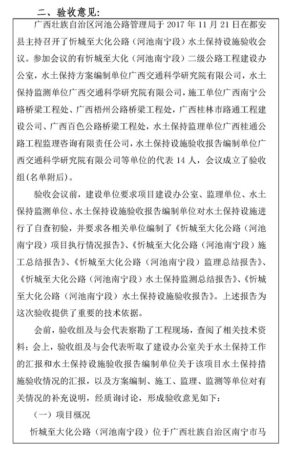 忻城至大化公路(河池南宁段)目前已通过水土保持设施验收,根据《水利部关于加强事中事后监管规范生产建设项目水土保持设施自主验收的通知》(水保[2017]365号)的要求,对该项目的水土保持设施验收情况公示如下: